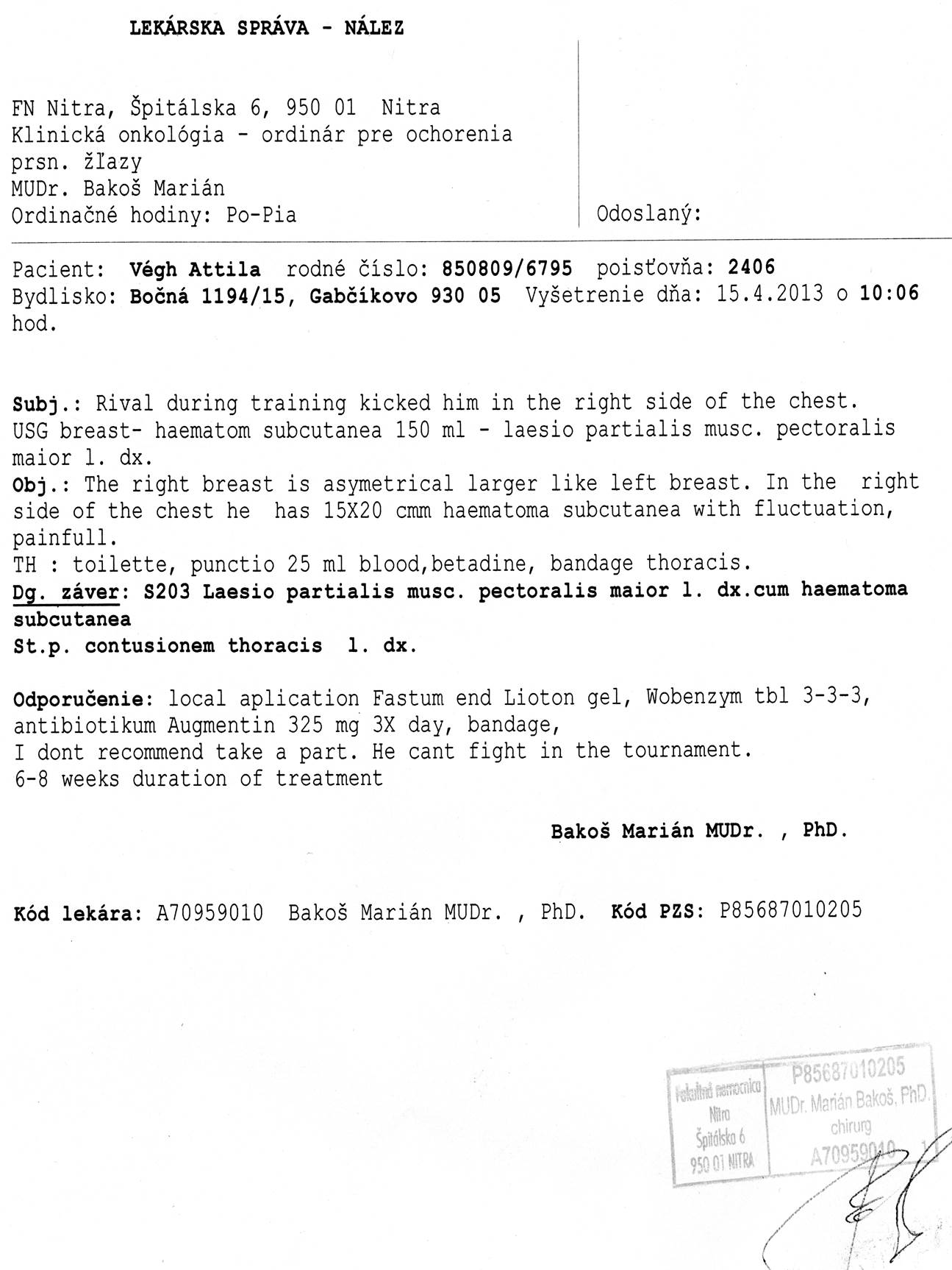 Kilka stron internetowych poruszyło historię Attili Vegha i wywiadu, który udzielił będąc w Polsce. Wywiad był robiony w języku polskim, natomiast Attila jest Słowakiem. W związku z tym wiele z tych publikacji było nieprawdziwych i zawierały zgubne informacje. Proszę zobaczcie załączony raport medyczny wraz z przesłanymi przez lekarza informacjami odnośnie stanu zdrowia Attili i wskazówek do których powinien się stosować przez następne miesiące. Z zaleceń wynika, że ma nie robić nic przez okres dwóch miesięcy.