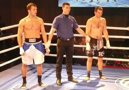 Najpierw walczył reprezentant Legnicy (Prych Team) Paweł Biszczak. Jego przeciwnikiem był reprezentant Białorusi Gienadij Tkachenka z Klubu Patriot Gym. Paweł mimo mocnego zmęczenia dzięki liczeniu w ostatniej dodatkowej rundzie po prawym prostym zaznaczył przewagę i wygrywa całą walką. W narożniku białorusina był między innymi wielokrotny mistrz świata Muay Thai i uczestnik walk japońskiego K-1 – Vitaly Gurkov.