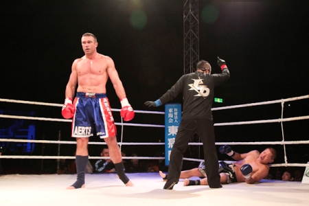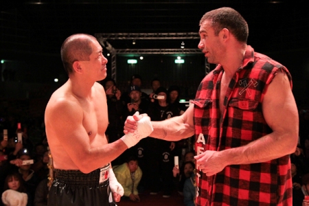 Japończyk zakończył swoje zadanie tuż przed upływem pierwszej rundy przekonując się, że przetrwanie rundy nawet z nie najmłodszym mistrzem to zbyt ambitne zadanie. Zanim otrzymał cios litości kolanem kończący nierówny bój nokautem, kilka razy zaliczył pobyty na deskach, bo w końcu jakoś czas na ringu trzeba było wypełnić. Ostatecznie Aerts na dwie sekundy przed końcem skończył walkę i zebrał burzę braw od miejscowej publiki, z której wywodził się jego rywal. Może to świadczyć o wielkim szacunku Japończyków wobec niego. Sam Peter z rywalem po walce demonstrowali przyjaźń i przemawiali do licznie zgromadzonej publiczności.